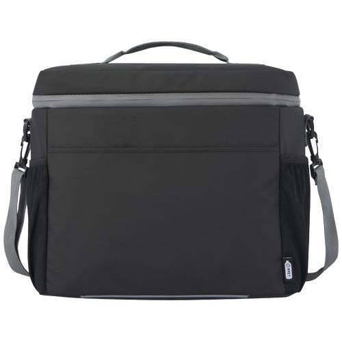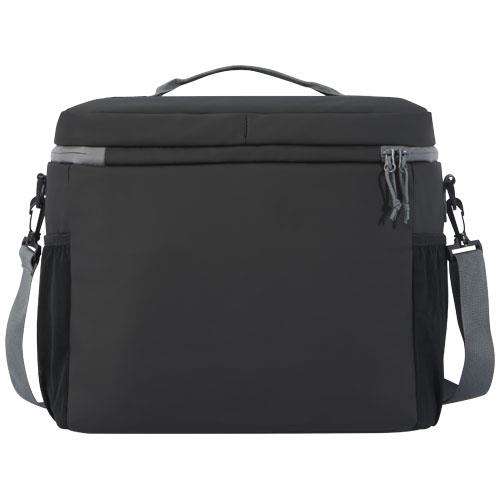 Wodoodporna torba termoizolacyjna mieszcząca 20 puszek wykonana z materiałów pochodzących z recyklingu z certyfikatem GRS, w tym zamków błyskawicznych. Posiada przestronną komorę zapinaną na zamek błyskawiczny wyłożoną bezpieczną dla żywności i bardzo grubą izolacją termiczną PEVA i pianką o wysokiej gęstości, dzięki czemu utrzymuje niską temperaturę napojów i przekąsek przez wiele godzin. Posiada również 2 kieszenie z siatki i jedną otwartą kieszeń przednią zapewniającą dodatkowe miejsce do przechowywania. Taśmowy uchwyt do przenoszenia oraz regulowany i wyściełany pasek na ramię zapewniają wygodę noszenia. Materiały z recyklingu GRS obejmują główny materiał, podszewkę, taśmy i zamki błyskawiczne. Pojemność: 22 litrów. Wolne od PVC.