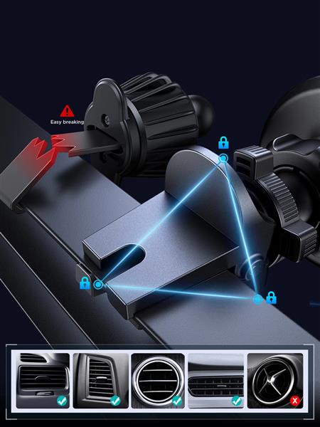 Mechaniczny zatrzask to gwarancja, że uchwyt pozostanie pewnie zamocowany na kratce wentylacyjnej. Trójkątna struktura dodatkowo wzmacnia stabilność, a wbudowany miękki silikon chroni przed zarysowaniami.