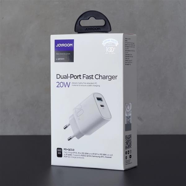 Joyroom szybka ładowarka sieciowa USB-A QC3.0 / USB-C PD 20W biała (L-QP2011)