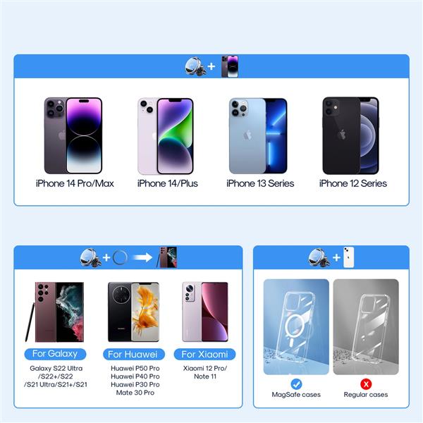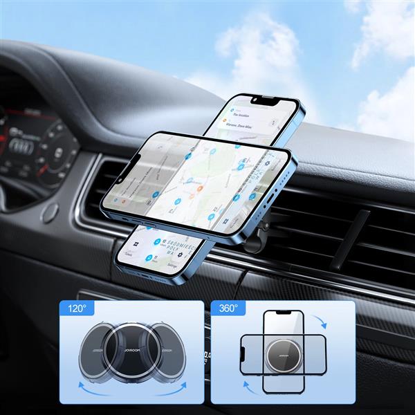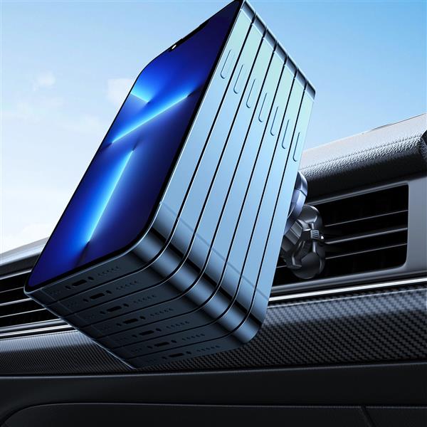 Jeśli szukasz niewielkiego uchwytu magnetycznego do kratki wentylacyjnej, który utrzyma Twój telefon stabilnie i mocno, wybierz Joyroom JR-ZS313. To bardzo kompaktowy i elegancki uchwyt kompatybilny zarówno z telefonami iPhone, jak i Samsung, Xiaomi, Huawei czy OnePlus – wystarczy, że przykleisz do swojego etui lub smartfona magnetyczną naklejkę dołączoną do zestawu. Uchwyt na telefon do samochodu magnetyczny ma stabilny klips montowany na kratce wentylacyjnej, więc nie zasłania widoku na drogę.