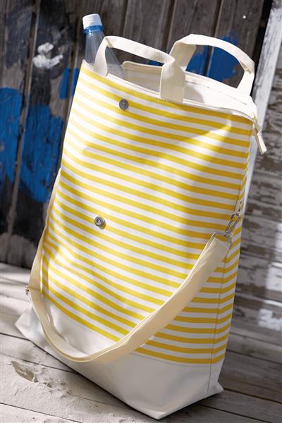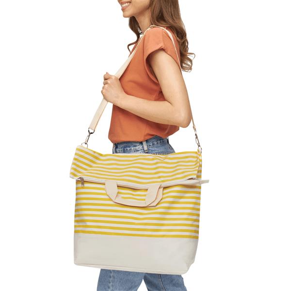 Torba plażowa JUIST z przestronną główną komorą na zamek, posiada 2 wygodne uchwyty do przenoszenia, regulowany i odpinany pasek na ramię, rozkładana dodatkowo dzięki guzikom magnetycznym (pojemność torby można zwiększyć lub zmniejszyć o około 25%). Materiał: 300D Poliester Kolor: beżowy, żółty Tagi: Torby,artykuły plażowe,bagaż