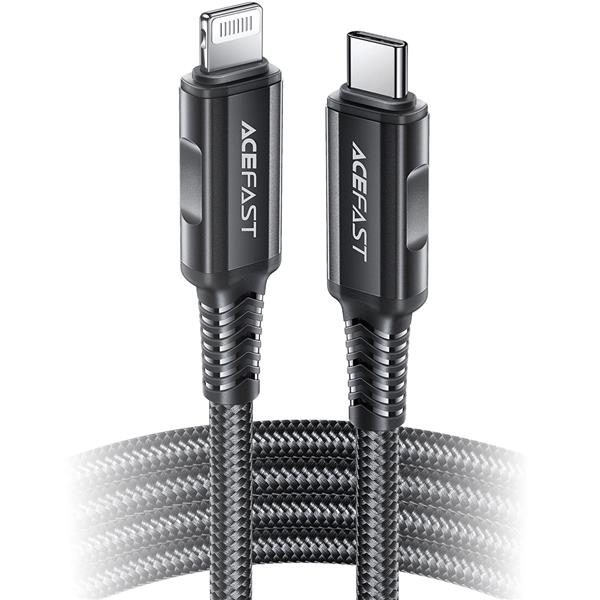Kabel USB Typ C – Lightning do ładowania i przesyłania danych marki Acefast. Przeznaczony jest do urządzeń marki Apple ze złączem Lightning. Ma długość 180 cm i jest przystosowany do pracy z prądem o obciążeniu 30W i natężeniu 3A. Jest kompatybilny z szybkim ładowaniem Power Delivery. Posiada certyfikat MFI (Maide For iPhone), dzięki czemu telefon nie wyświetli komunikatu o nieoryginalnym akcesorium. Kabel na całej długości jest opleciony nylonem. Wtyczki posiadają aluminiową obudowę. Końcówki kabla posiadają osłony zapobiegające przed uszkodzeniem w miejscu najczęstszego zginania.