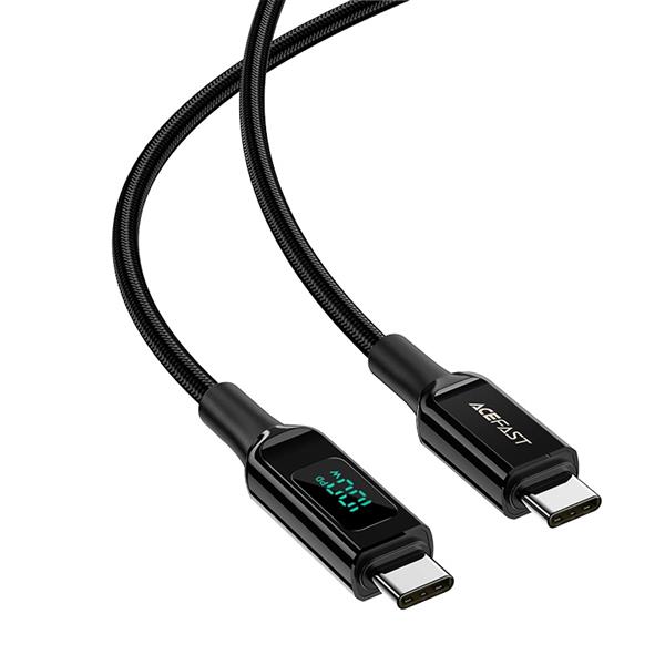 Kabel USB Typ C – USB Typ C do ładowania i transferu danych marki Acefast. Jest przeznaczony do urządzeń ze złączem USB Typ C. Ma długość 200 cm i może pracować z prądem o obciążeniu 100W i natężeniu 5A. Umożliwia szybkie ładowanie w technologii Power Delivery. Może służyć do zasilania notebooków ze złączem USB Typ C, które potrzebują prądu o mocy do 100W (sprawdź specyfikację swojego laptopa). Kabel na całej długości jest opleciony nylonem. Ma wbudowany ekran, na którym w czasie ładowania jest wyświetlana aktualna wartość mocy z jaką urządzenie jest ładowane. Wtyczki posiadają aluminiową obudowę. Końcówki kabla posiadają osłony zapobiegające przed uszkodzeniem w miejscu najczęstszego zginania.