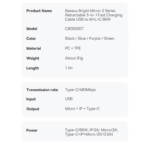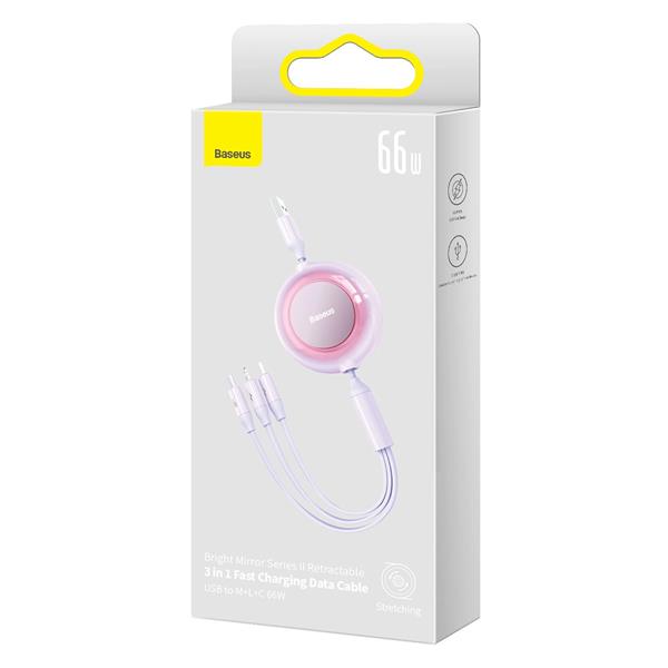 Kabel Baseus Bright Mirror 2 CAMJ010105 zwijany 3w1 USB-A – micro USB / Lightning / USB-C 66W 1.1m – fioletowy