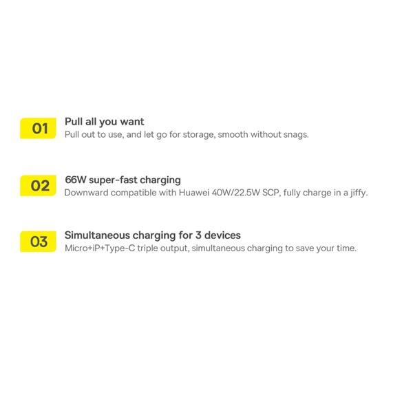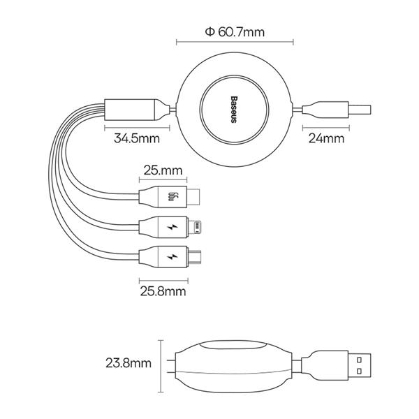 Kabel Baseus oferuje Ci wiele możliwości. Za jego pomocą możesz jednocześnie ładować różne urządzenia. Wszystko dzięki specjalnemu rozgałęzieniu na trzy osobne końce. Zyskujesz dzięki temu wyjście USB typu C, microUSB oraz iP. W praktyce oznacza to, że możesz zrezygnować z trzech różnych kabli i zastąpić go jednym uniwersalnym, który zawsze możesz mieć przy sobie.