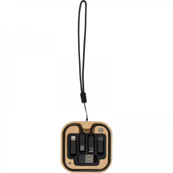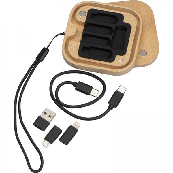 Zestaw zawierający kabelek typu CC i trzy dodatkowe końcówki do szybkiego i wygodnego ładowania urządzeń. Całość zapakowana jest w drewniane pudełko z wieczkiem zamykanym na magnes, przymocowanym do wygodnej smyczy. W zestawie znajdują się końcówki: USB, micro USB, lightning.
