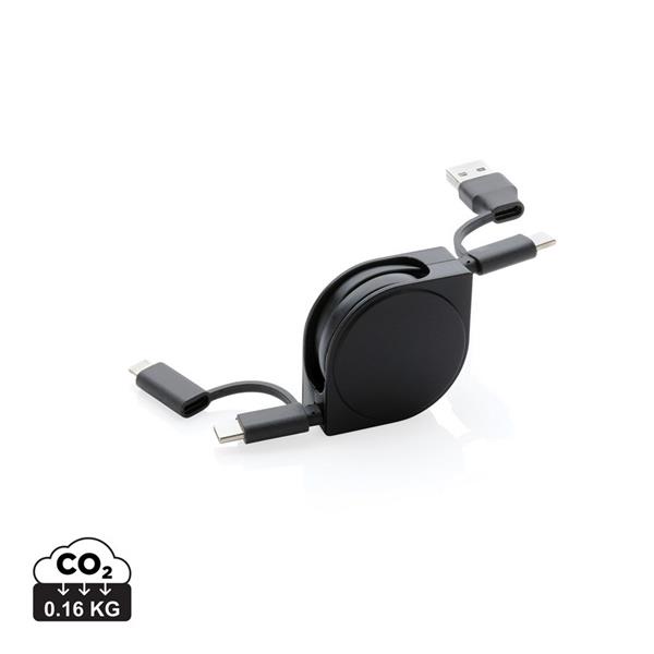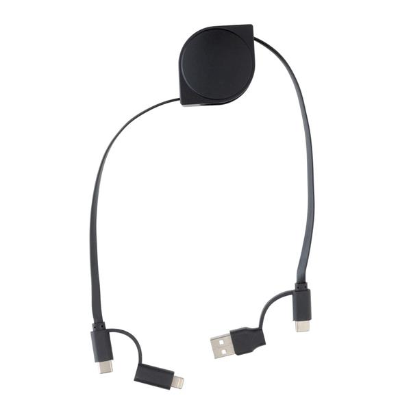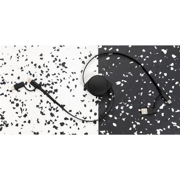 Zwijany kabel do ładowania z 4 końcówkami: USB, 2 x typu C i 2 w 1 (micro USB oraz kompatybilną z urządzeniami iOS), obudowa wykonana z ABS pochodzącego z recyklingu, posiadają certyfikat RCS (Recycled Claim Standard), który jest stosowany gdy produkt jest wykonany częściowo lub w całości z materiałów pochodzących z recyklingu, nie zawiera PVC, ślad węglowy produktu: 0,16 kg CO2