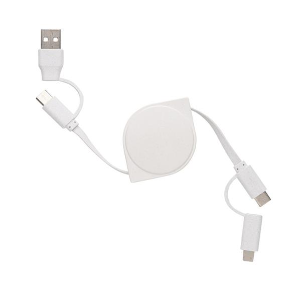 Zwijany kabel do ładowania z 4 końcówkami: USB, 2 x typu C i 2 w 1 (micro USB oraz kompatybilną z urządzeniami iOS), obudowa wykonana z ABS pochodzącego z recyklingu, posiadają certyfikat RCS (Recycled Claim Standard), który jest stosowany gdy produkt jest wykonany częściowo lub w całości z materiałów pochodzących z recyklingu, nie zawiera PVC, ślad węglowy produktu: 0,16 kg CO2