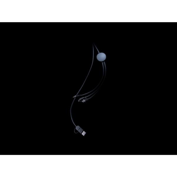 Kabel do ładowania, końcówki: USB, 2 x USB C, micro USB, iOS, obudowa wykonana i ABS z recyklingu z certyfikatem RCS (Recycled Claim Standard) który gwarantuje, że wykorzystane materiały pochodzą z recyklingu, kabel z TPE z recyklingu, długość 120 cm, nie zawiera PVC