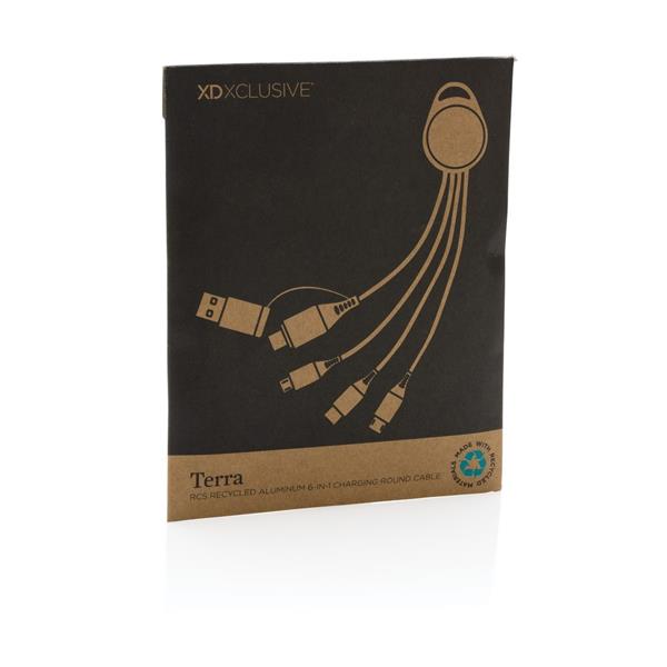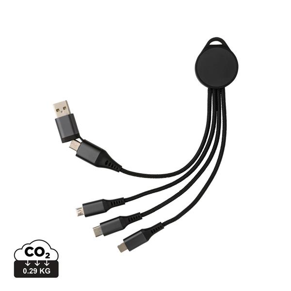 Kabel do ładowania 6 w 1, wykonany z certyfikowanych materiałów pochodzących z recyklingu, całkowita zawartość materiałów z recyklingu obliczona na podstawie wagi całkowitej przedmiotu: 68%, 5 końcówek: wejście USB typu C, wejście USB-A, wyjście USB typu C, wyjście iOS, wyjście micro USB, funkcja szybkiego ładowania 18W, w pudełku kraftowym