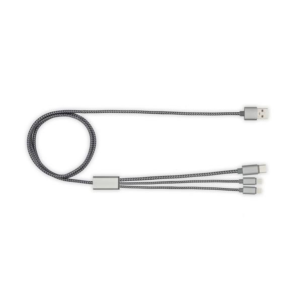 Kabel do ładowania i synchronizacji BrandCharger Trident 2+, o żywotności ponad 12 000 zgięć, co czyni go sześciokrotnie mocniejszym niż standardowe kable, zbudowany z aluminiowej podstawy i wzmocnionego nylonowego oplotu, kompatybilny ze złączami USB-A, typu-C i kompatybilny z urządzeniami iOS, produkt wykonany z nylonu, aluminium i RPET
