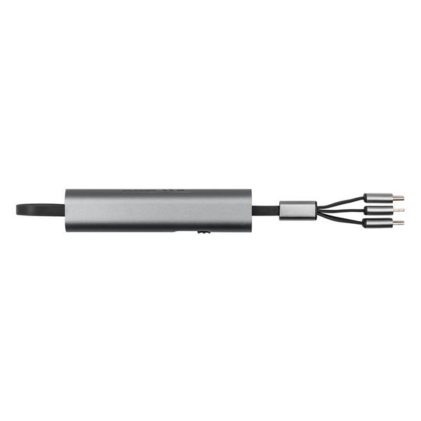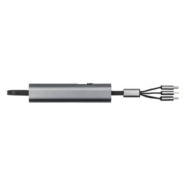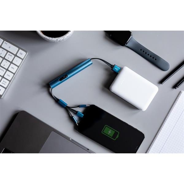 Kabel do ładowania z 4 końcówkami: USB, micro USB, USB-C oraz kompatybilną z urządzeniami iOS, moc maksymalna ładowania USB C do USB C 15W, pozostałe złącza 10W, co umożliwia jednoczesne ładowanie kilku urządzeń o różnych złączach, końcówka USB-C z funkcją transferu danych, długość kabla: 28 cm, obudowa kabla posiada dużą powierzchnię, która może zostać oznakowana i być nośnikiem logotypu lub hasła marketingowego, produkt wykonany z metalu i ABS