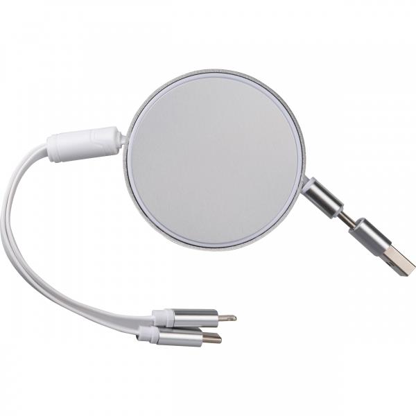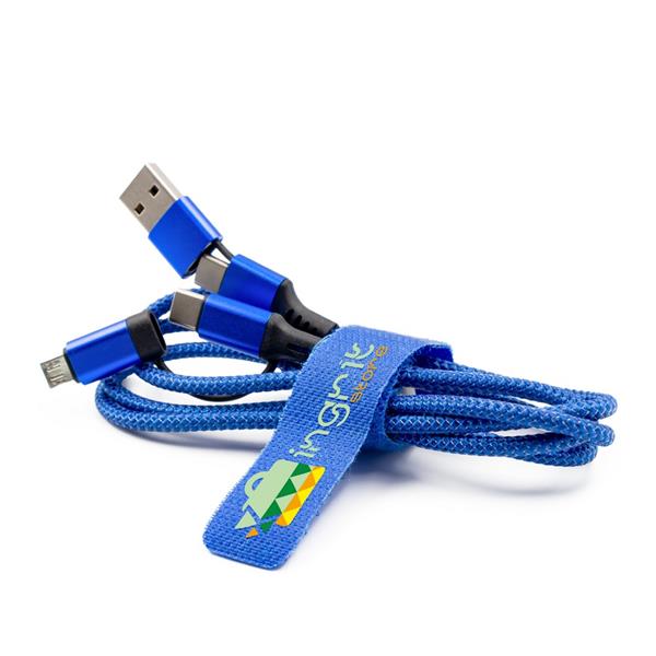 Kabel do ładowania i synchronizacji z 4 końcówkami: USB, 2x USB typu C oraz micro USB, długość 100 cm, połączony paskiem na rzep z miejscem na znakowanie