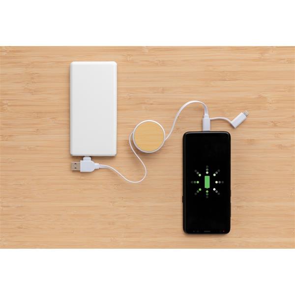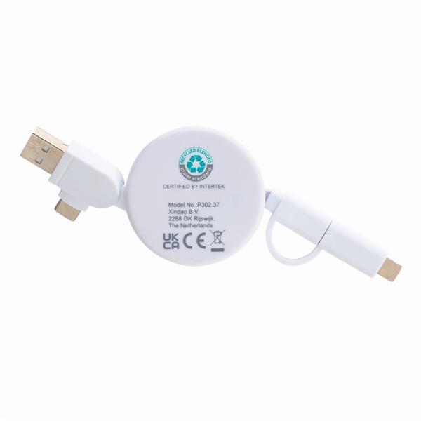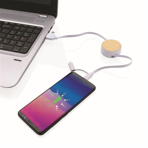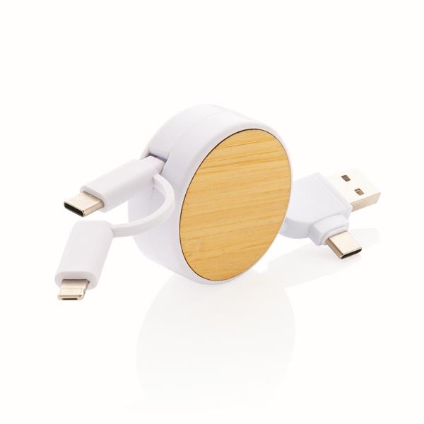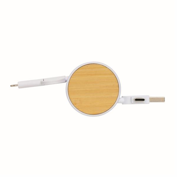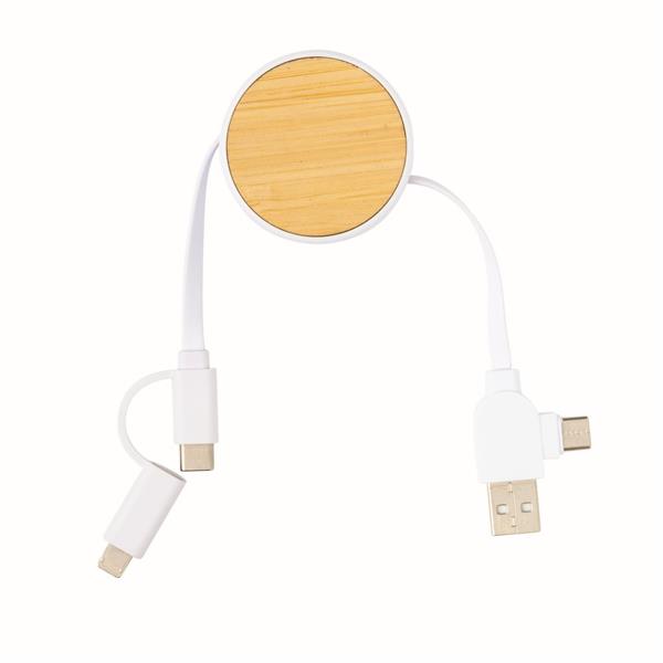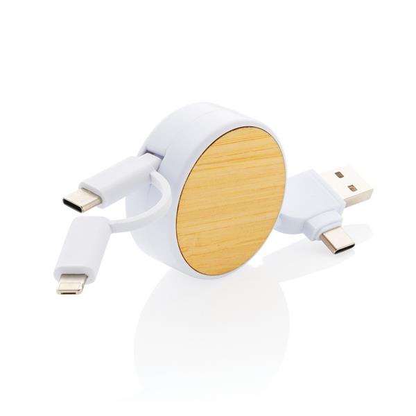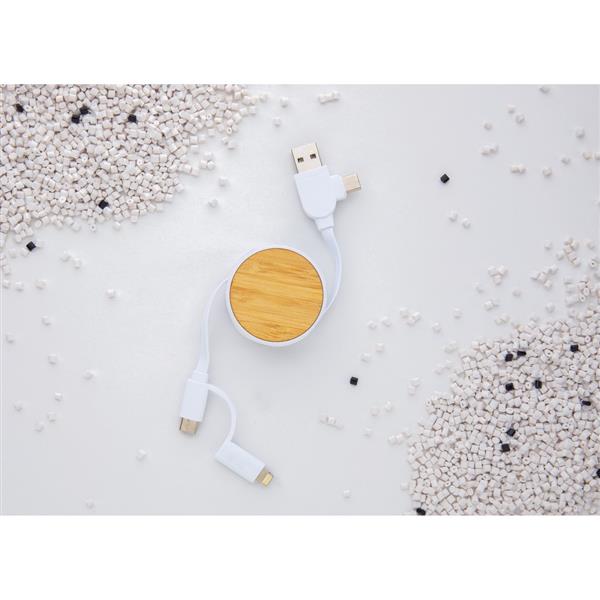 Kabel do ładowania, końcówki: USB, 2 x USB C, micro USB, iOS, obudowa wykonana z bambusa i ABS z recyklingu, kabel wykonany z TPE z recyklingu, kabel i obudowa posiadają certyfikaty RCS, długość 100 cm, nie zawiera PVC