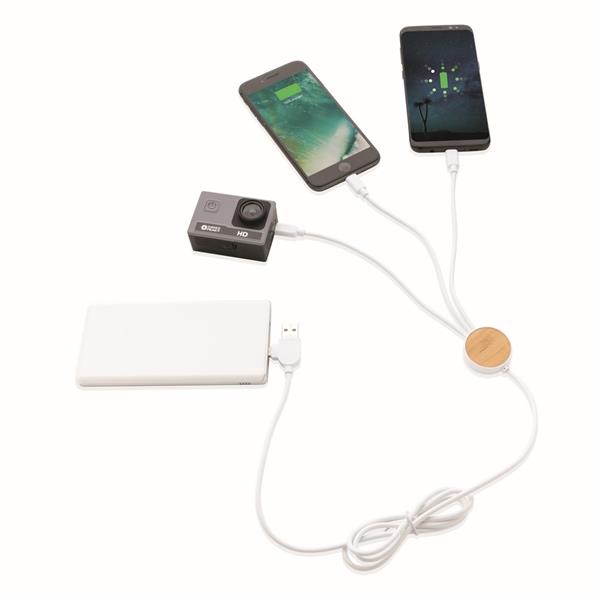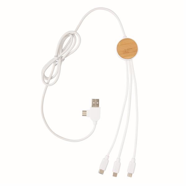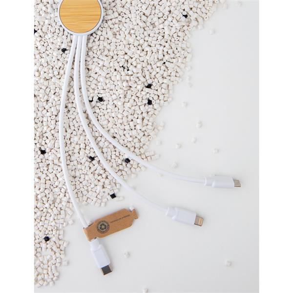 Kabel do ładowania, końcówki: USB, 2 x USB C, micro USB, iOS, obudowa wykonana z bambusa i ABS z recyklingu, kabel wykonany z TPE z recyklingu, kabel i obudowa posiadają certyfikaty RCS, długość 120 cm, nie zawiera PVC