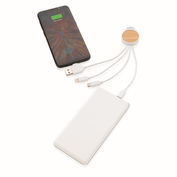 Kabel do ładowania, końcówki: USB, 2 x USB C, micro USB, iOS, obudowa wykonana z bambusa i ABS z recyklingu, kabel wykonany z TPE z recyklingu, kabel i obudowa posiadają certyfikaty RCS, długość 20 cm, nie zawiera PVC