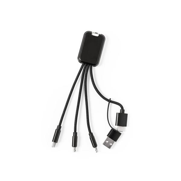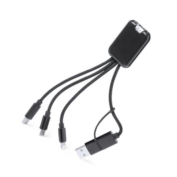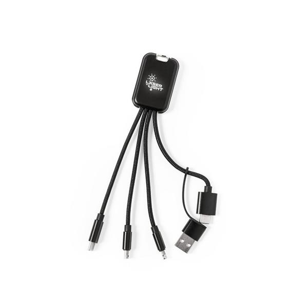Kabel do ładowania z 5 końcówkami: USB, 2x USB typu C, micro USB oraz końcówką kompatybilną z urządzeniami iOS, 5V/2.4A, grawer ukazuje podświetlaną powierzchnię