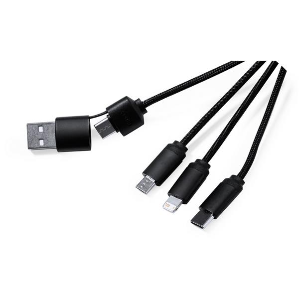 Kabel do ładowania z karabińczykiem z 5 końcówkami: USB, micro USB, 2x USB-C oraz końcówką kompatybilną z urządzeniami iOS, 5V/2.4A, bambusowy element, grawer ukazuje podświetlaną powierzchnię