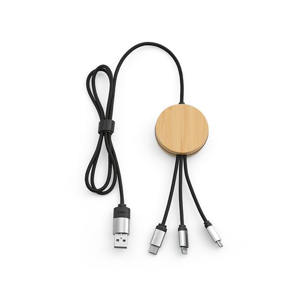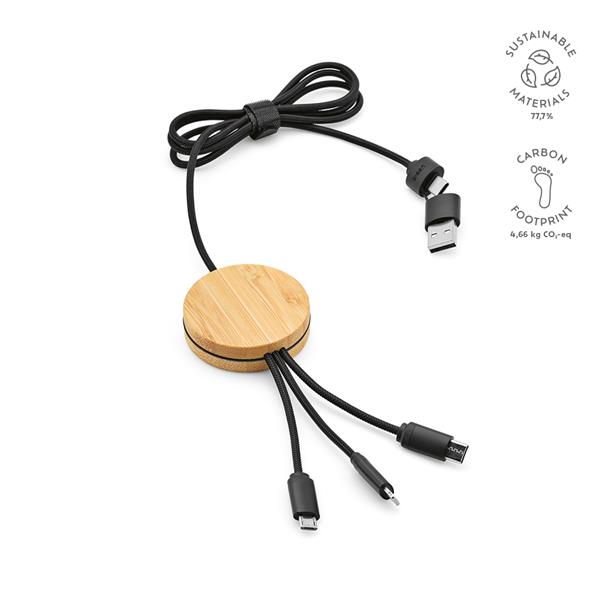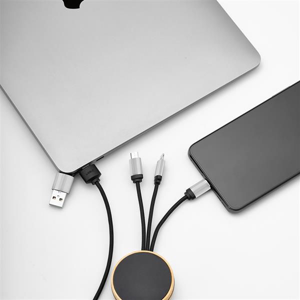 Rozpocznij nową epokę łączności z naszym 1-metrowym kablem. Dzięki obudowie misternie wykonanej z bambusa i recyklingowanego plastiku PET, bezbłędnie łączy USB-A, USB-C, Micro- USB, Lightning i ładowanie bezprzewodowe. Podnieś swoje wrażenia technologiczne podczas szybkiego ładowania.