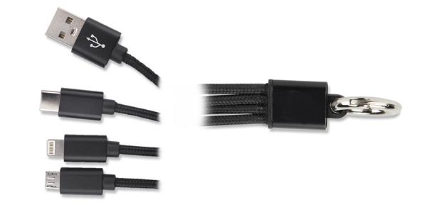 Kabel USB 3 w 1 TAUS do ładowania różnych urządzeń posiada trzy końcówki: micro USB, Lightning (iPhone) i USB typu C. Kabel jest powleczony tkaniną, a końcówki USB są wykonane z metalu. Praktyczny gadżet dla każdego użytkownika mobilnych urządzeń.