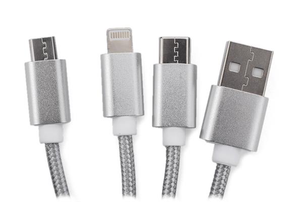 Kabel USB 3 w 1 TAUS do ładowania różnych urządzeń posiada trzy końcówki: micro USB, Lightning (iPhone) i USB typu C. Kabel jest powleczony tkaniną, a końcówki USB są wykonane z metalu. Praktyczny gadżet dla każdego użytkownika mobilnych urządzeń.