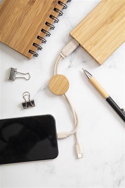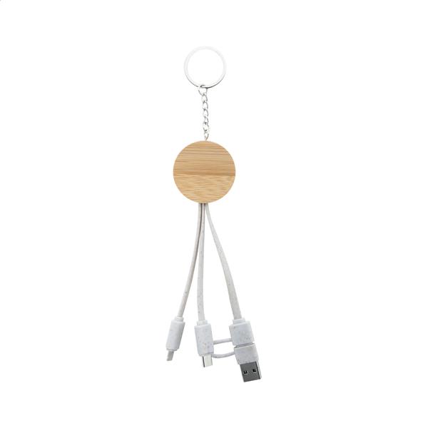 Brelok do kluczy z kabelkami USB do ładowarki z ekologicznego plastiku ze słomy pszenicznej i bambusa. Ze złączami micro USB, USB-C i Lightning. Z wejściami USB i USB-C.
