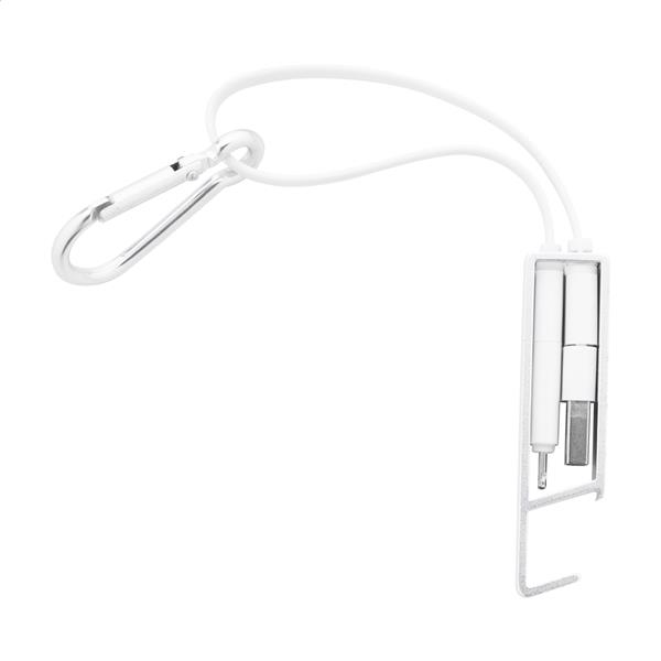 Kabel do ładowania USB z karabińczykiem z recyklingowanego aluminium i uchwytem na telefon z funkcją otwieracza do butelek. Z wtyczkami micro USB, USB-C i Lightning. Z wejściami USB i USB-C.