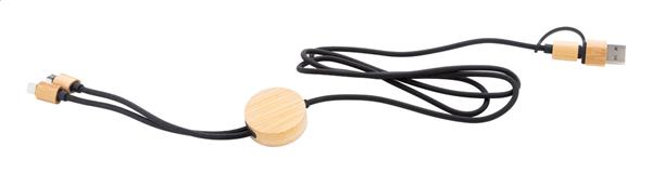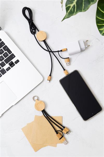 Kabel ładujący USB RPET i bambusowy ze złączami micro USB, USB-C i Lightning. Z wejściami USB i USB-C. Długość kabla: 100 / 120 cm.