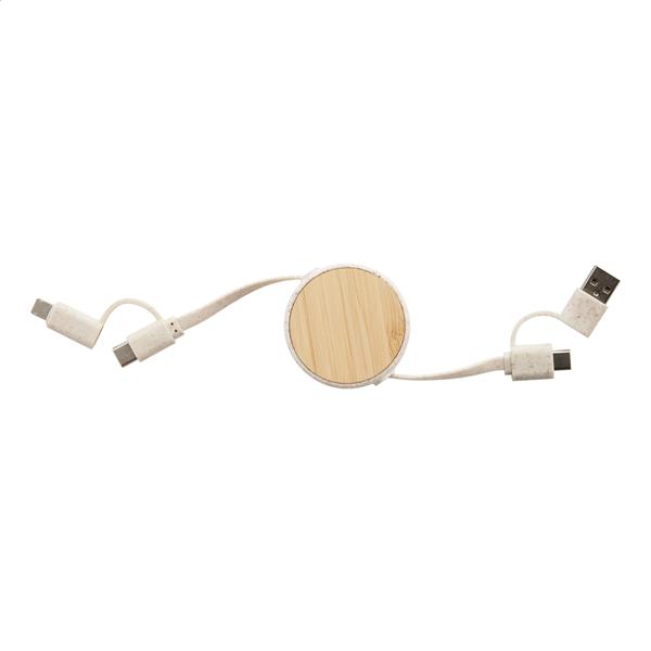 Zwijany kabel ładujący USB z ekologicznego plastiku ze słomy pszenicznej i bambusa. Ze złączami micro USB, USB-C i Lightning. Z wejściami USB i USB-C.