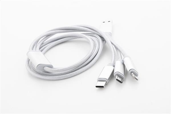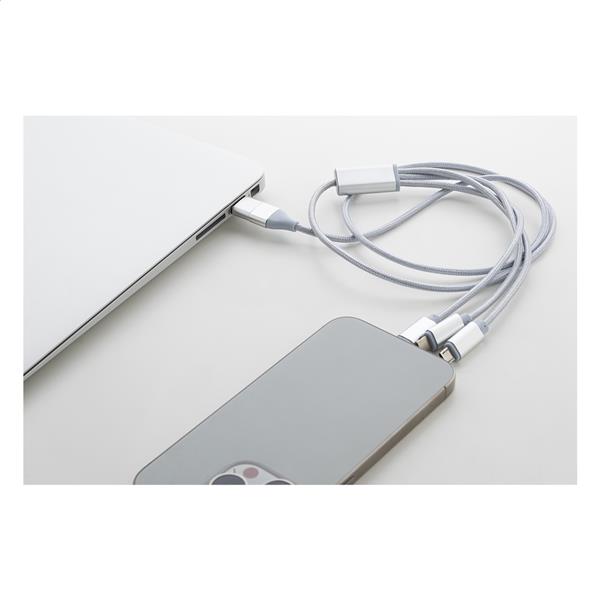 Kabel ładujący USB z recyklingowanego aluminium i RPET ze złączami micro USB, USB-C i Lightning. Z wejściami USB i USB-C. Długość kabla: 100 / 120 cm.