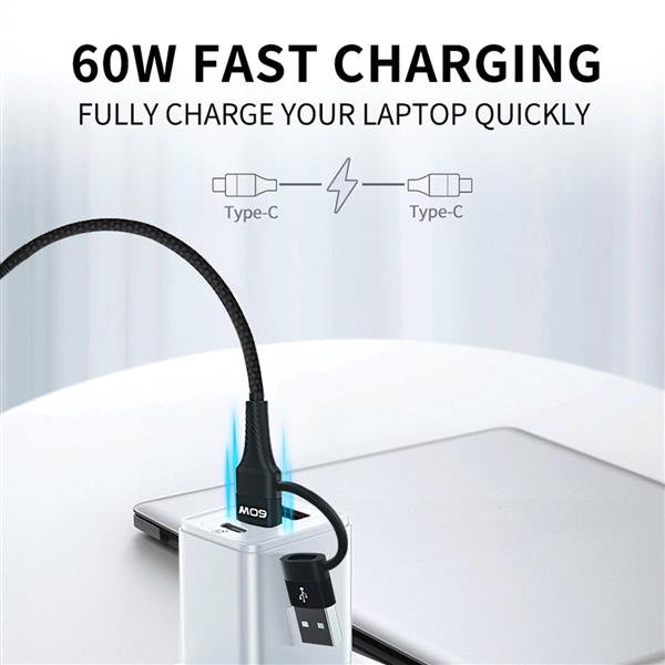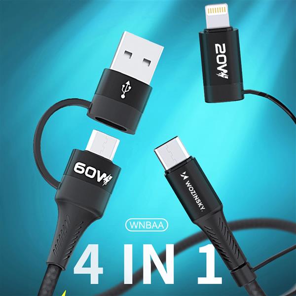 Kabel Wozinsky WNBAA 4w1 gwarantuje szybkie ładowanie z mocą do 60W dla połączeń USB-C / USB-C i 20W dla USB-C / Lightning. Jest to idealne rozwiązanie dla osób potrzebujących szybko naładować swoje urządzenia.