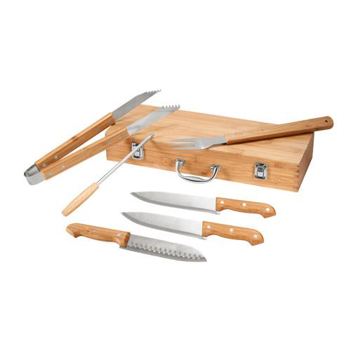 Zestaw do grillowania dostarczany w bambusowym etui. Zawiera 6 elementów ze stali nierdzewnej i bambusa: nóż szefa kuchni, nóż średni, nóż japoński, szczypce, widelec i ostrzałkę do noży. Ponieważ produkt jest wykonany z naturalnych materiałów, kolor produktu oraz wynik drukowania mogą się różnić w zależności od produktu. Doosje: 455 x 160 x 65 mm