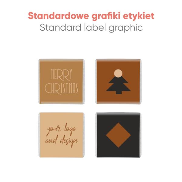 Każda czekoladka zabezpieczona jest folią w kolorach do wyboru: : srebrna, złota, czerwona, granatowa, czarna lub biały pergamin w 100% kompostowalny,. Ponadto czekoladki posiadają papierowe etykiety, których szatę graficzną możesz personalizować, podobnie jak powierzchnię całego pudełka kalendarza. To sprawia, że kalendarz staje się wysmakowanym nośnikiem reklamy Twojej firmy w okresie świątecznym.