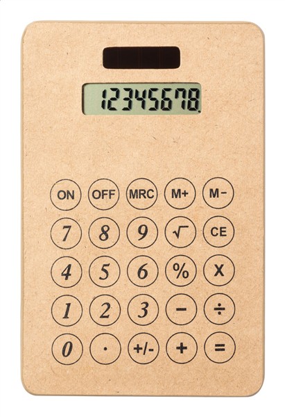 Kalkulator z 8-cyfrowym wyświetlaczem, zasilany energią słoneczną w obudowie z papieru pochodzącego z recyklingu. W zestawie bateria guzikowa.