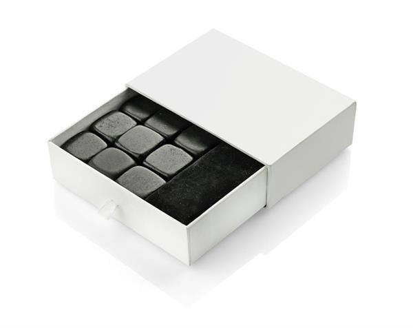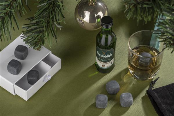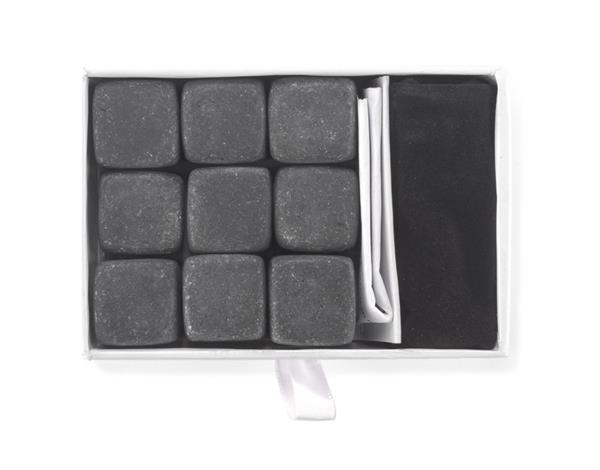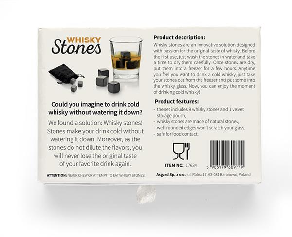 Kamienie do whisky – zupełna nowość na rynku – gadżet dla wymagających klientów, w szczególności dla koneserów whisky. Ten zestaw 9 specjalnych kamieni zastępuje kostki lodu. Kostki należy umieścić na minimum 4 godziny w zamrażalniku, aby uzyskały pożądaną temperaturę. Po wyjęciu można ich użyć zamiast kostek lodu. Najważniejsze zalety tego rozwiązania w porównaniu do kostek lodu to: nie rozcieńczają napoju, można je wykorzystać wielokrotnie, są niezwykle oryginalne. Kostki wykonane są z naturalnego bazaltu. Produkt posiada atest dopuszczający do kontaktu z żywnością.