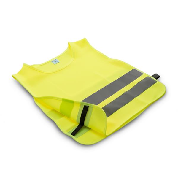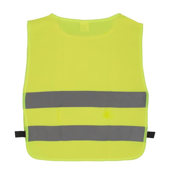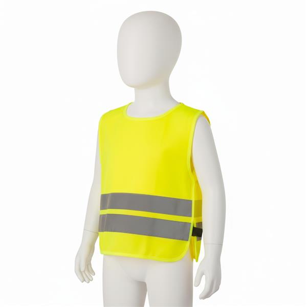 Kamizelka dziecięca odblaskowa, posiada po dwa paski odblaskowe z przodu i z tyłu, certyfikowana zgodnie z EN17353