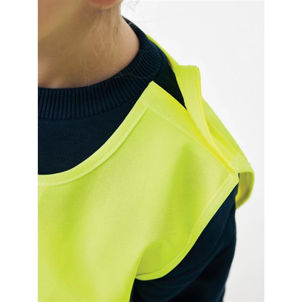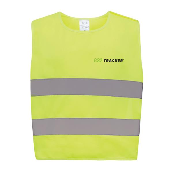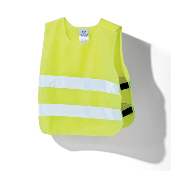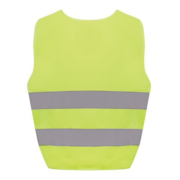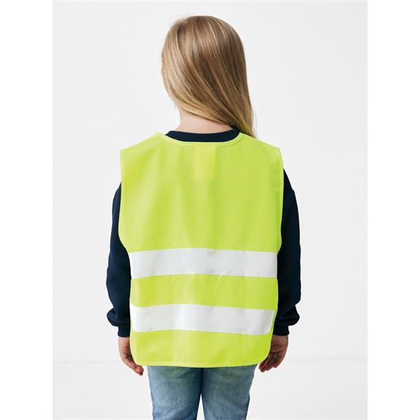 Kamizelka, rozmiar dziecięcy XXS, odpowiednia dla dzieci o wzroście od 90 do 140 cm, wykonana z RPET, całkowita zawartość materiałów z recyklingu obliczona na podstawie wagi całkowitej przedmiotu: 55%, zgodna z normą EN 17353:2020 typ AB3 oraz z rozporządzeniem UE 2016/425, ślad węglowy produktu: 0,67 kg CO2