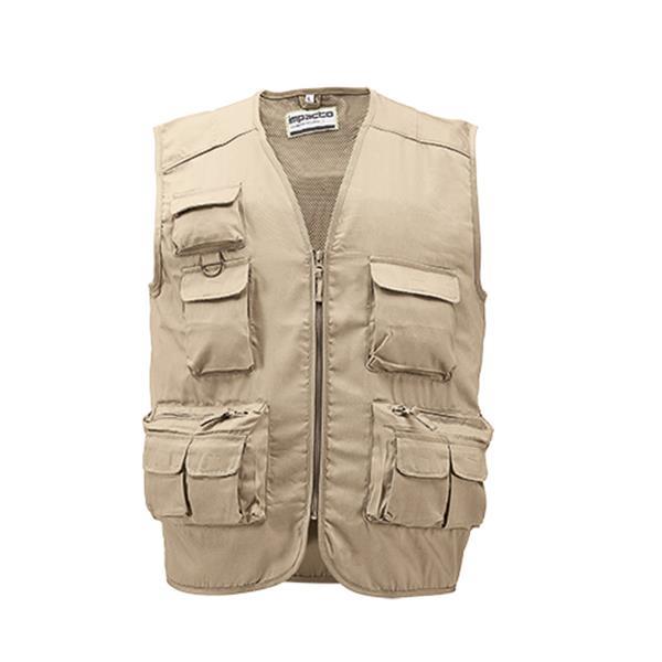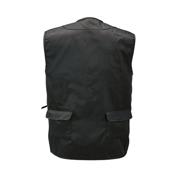 Kamizelka z bawełny o skośnym splocie, posiada liczne kieszenie i nylonowy zamek błyskawiczny.