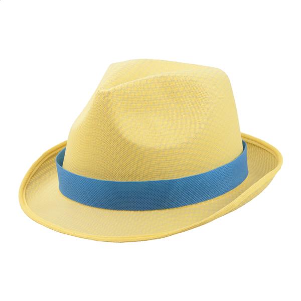 Słomkowy kapelusz, tasiemka kapelusza sprzedawana oddzielnie. Materiał: Poliester. Na tym kapeluszu nie można wykonać bezpośredniego nadruku; istnieje możliwość personalizacji za pomocą naszych wstążek do kapeluszy z nadrukiem sublimacyjnym (AP718139 / AP718367).