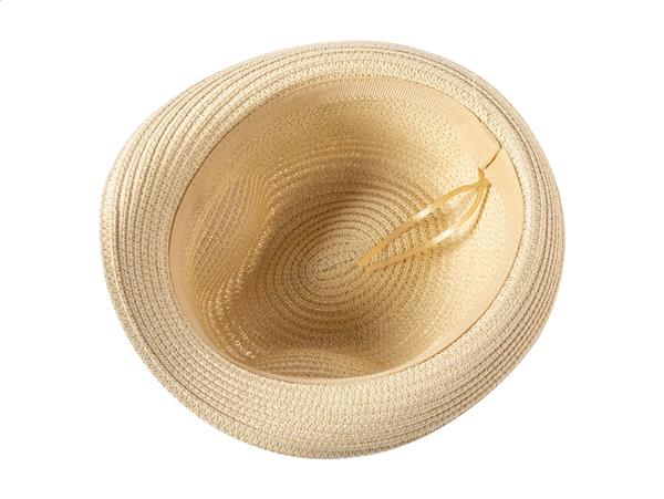 Słomkowy kapelusz unisex z włókna syntetycznego z ozdobną opaską i regulowanym paskiem wewnętrznym.