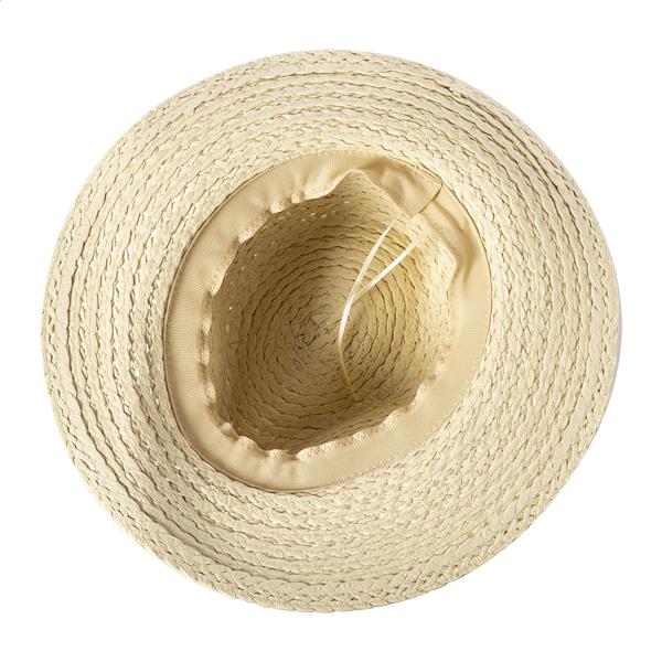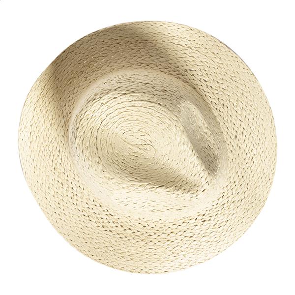 Słomkowy kapelusz z włókna syntetycznego z regulowanym paskiem wewnątrz – unisex. Na tym kapeluszu nie można wykonać bezpośredniego nadruku; istnieje możliwość personalizacji za pomocą naszych wstążek do kapeluszy z nadrukiem sublimacyjnym (AP718139 / AP718367).