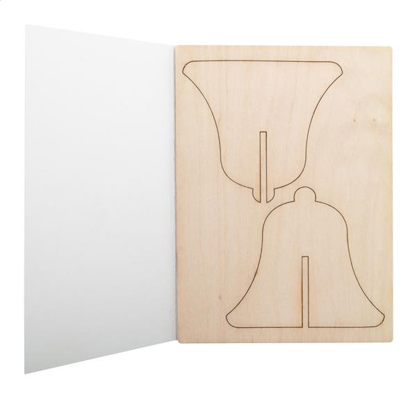 Description: Personalizowana, papierowa karta świąteczna z dowolną grafiką po obu stronach i drewnianą ozdobą do składania. Zawiera kopertę C6. Min. zamówienie: 100 szt. Primary Color: naturalny Material 1: Papier Material 2: Drewno Rozmiar: 107×148×3mm Shape: dzwon