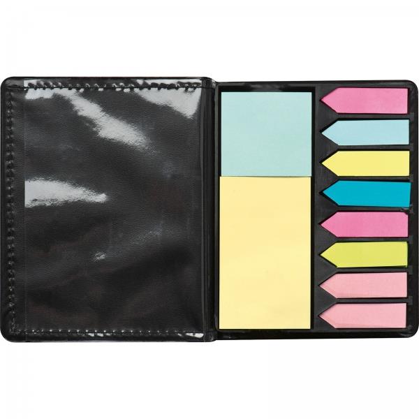 Praktyczny zestaw karteczek złożony z 200 niebieskich i żółtych karteczek oraz 8 mniejszych różnokolorowych bloczków. Całość znajduje się w etui z PU, w którym można również przechowywać np. wizytówki.