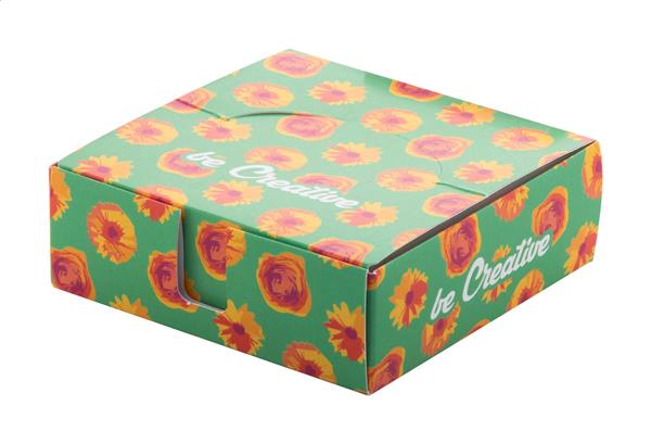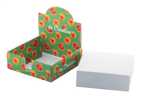 Description: Wykonany na zamówienie dozownik karteczek z blokiem 300 karteczek z papieru z recyklingu (90×90 mm). Cena obejmuje nadruk w full kolorze na dozowniku. Min. ilość: 100 szt. Primary Color: biały Material 1: Papier z recyklingu Rozmiar: 97×97×102 mm