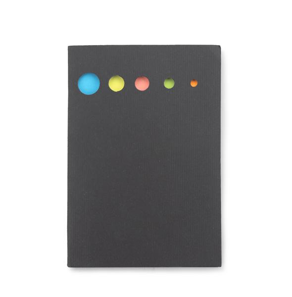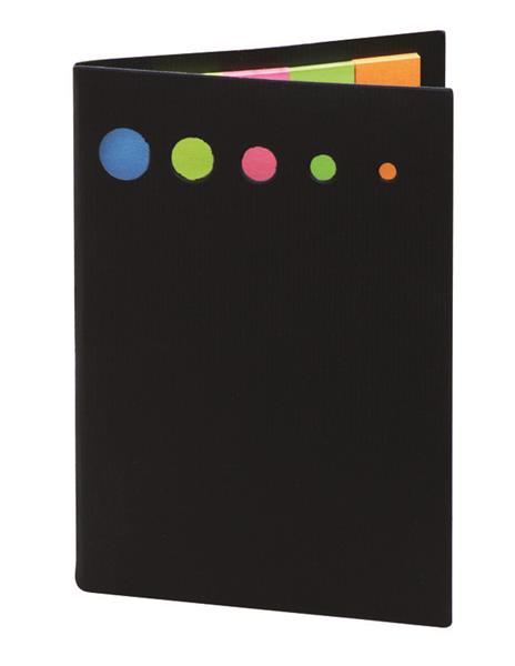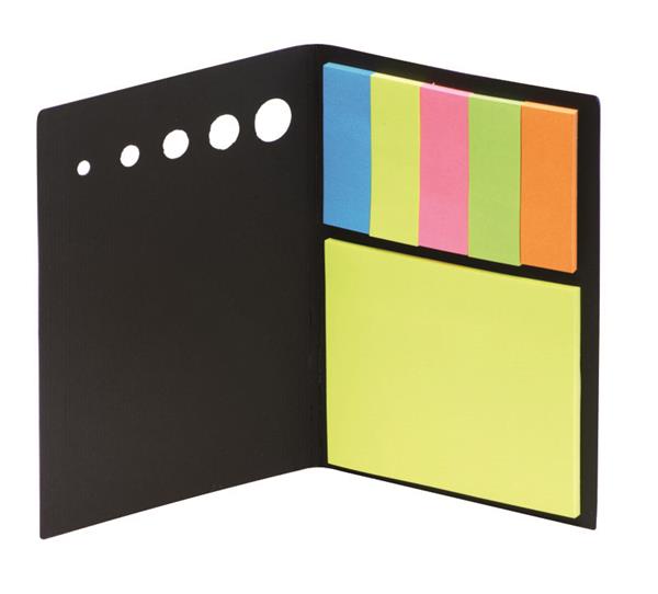 Karteczki samoprzylepne w pięciu kolorach oraz samoprzylepny notesik, umieszczone w czarnej okładce. Logo nadrukujemy na etui metodą tampodruku.