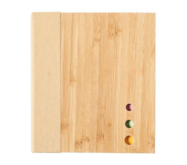 Samoprzylepny notatnik z papieru makulaturowego pokrytego bambusem, zawierający 115 dużych, 115 średnich i 420 mini karteczek samoprzylepnych (w 3 różnych kolorach).
