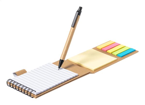 Notatnik na spirali pokryty papierem z recyklingu, 30 kartek w linie, 25 karteczek samoprzylepnych i 125 zakładek (w 5 różnych kolorach). Z funkcją uchwytu na telefon komórkowy. Zawiera długopis z papieru z recyklingu z niebieskim wkładem.