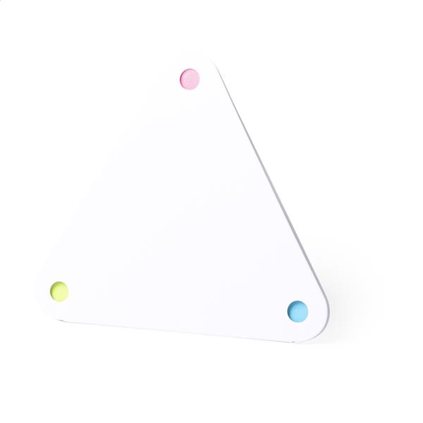 Trójkątny, wykonany z recyklingu, tekturowy notatnik z samoprzylepnymi karteczkami w 2 rozmiarach. Zawiera 20 szt. sześciokątnych i 60 szt. trójkątnych karteczek.