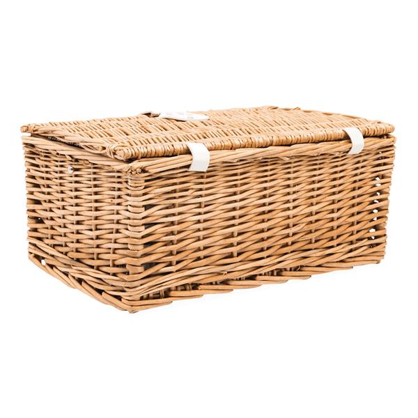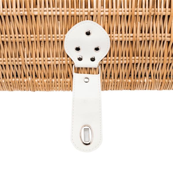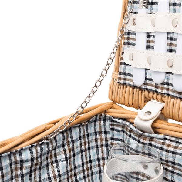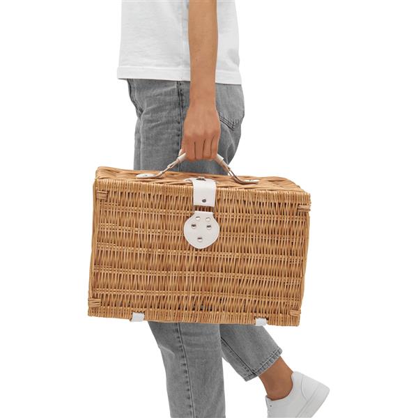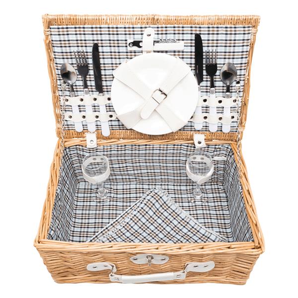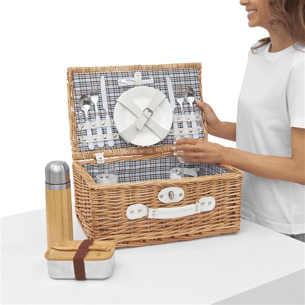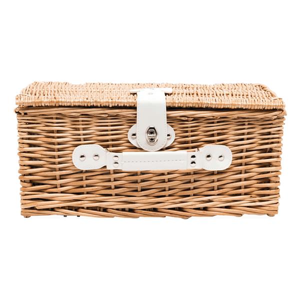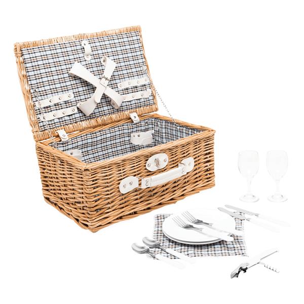 Wiklinowy koszyk piknikowy KINGS PARK dla dwóch osób. Zawiera sztućce ze stali nierdzewnej z plastikowymi rączkami, ceramiczne talerze, kieliszki na wino, serwetki oraz nóż kelnerski. Kosz z uchwytem i zamknięciem typu twist.