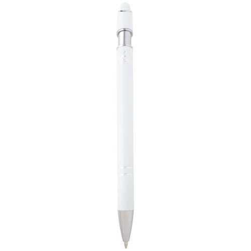 Długopis Kish ze srebrnym wykończeniem ma korpus wykonany z aluminium z recyklingu i rysik dotykowy wykonany z silikonu. Aluminium z recyklingu ogranicza ilość odpadów na wysypiskach śmieci i pomaga chronić zasoby naturalne w celu zmniejszenia emisji gazów cieplarnianych. Kolor tuszu: Niebieski. Żywotność: 800 metrów. Rozmiar stalówki: 1,0 mm.